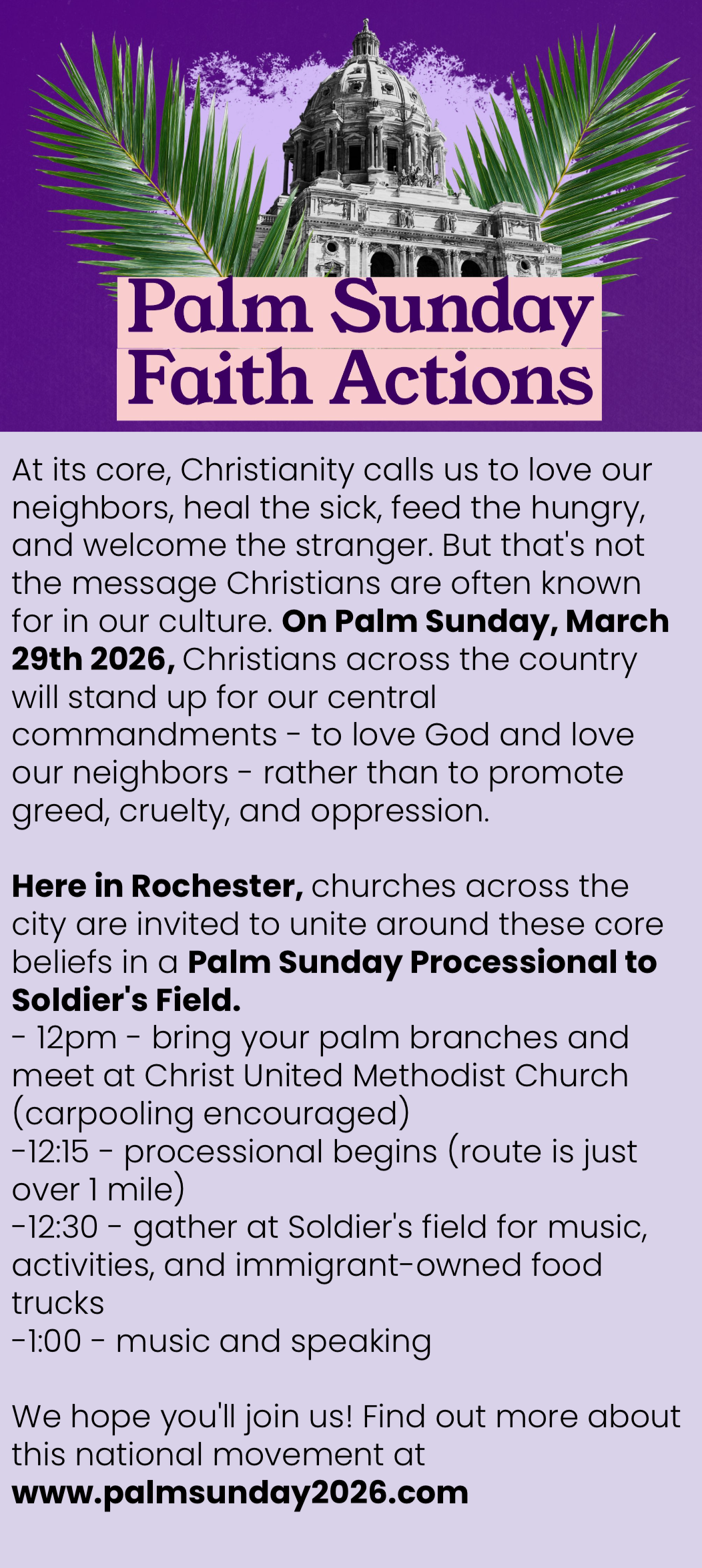 On the day Christians celebrate as Palm Sunday, Jesus entered Jerusalem in opposition to the greed, cruelty, and oppression of the Roman Empire on a donkey, a symbol of a just, humble leader who cares for the poor, the hungry, the sick, and the stranger. Christians will follow Jesus and embody the heart of our faith on Palm Sunday 2026. We will draw a contrast to the values guiding the actions of the current administration, as we embody and celebrate our love for God and love for our neighbors, regardless of where we come from or what we look like.